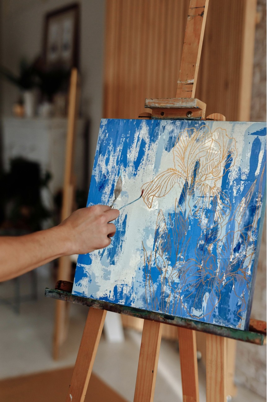 Enhance your space with this striking abstract painting, featuring a mesmerizing golden line on a deep black and dark blue background...