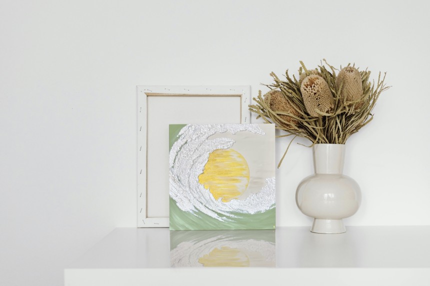 Bring the serenity of the coastline into your space with this modern minimalist abstract painting, inspired by an aerial view of the shore...